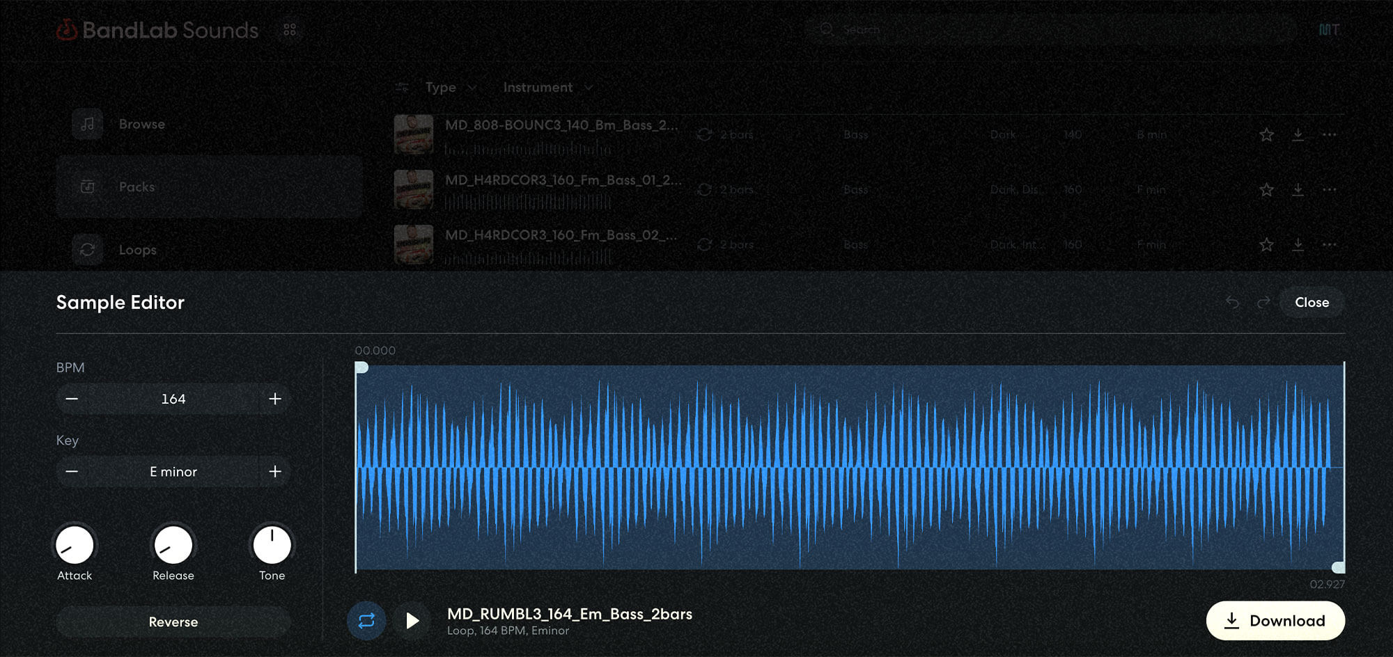With the BandLab Sounds platform, you too can audition particular person samples earlier than you obtain them; you’ll be able to edit their tempo and key, and might trim the pattern to your required size. There are additionally parameters for assault, launch, and tone, plus an choice to reverse the pattern earlier than you obtain it. BandLab Sounds has organised the samples by key, tempo, character, size and instrument, so you will discover what you’re on the lookout for fairly rapidly.